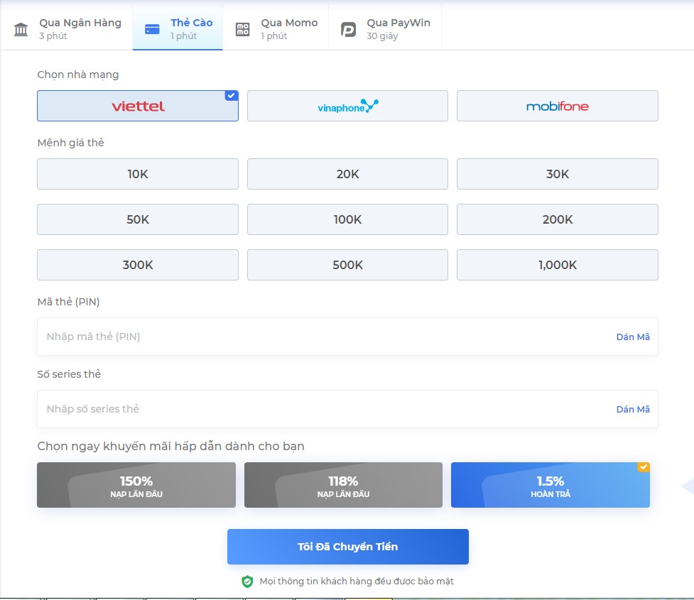- Bước 3: Sau khi đã lựa chọn được phương thức nạp tiền, bạn cần phải điền đầy đủ tất cả thông tin theo yêu cầu của hệ thống, bao gồm: Họ tên, số tiền mà bạn muốn nạp, mã giao dịch, khuyến mãi (nếu có)…