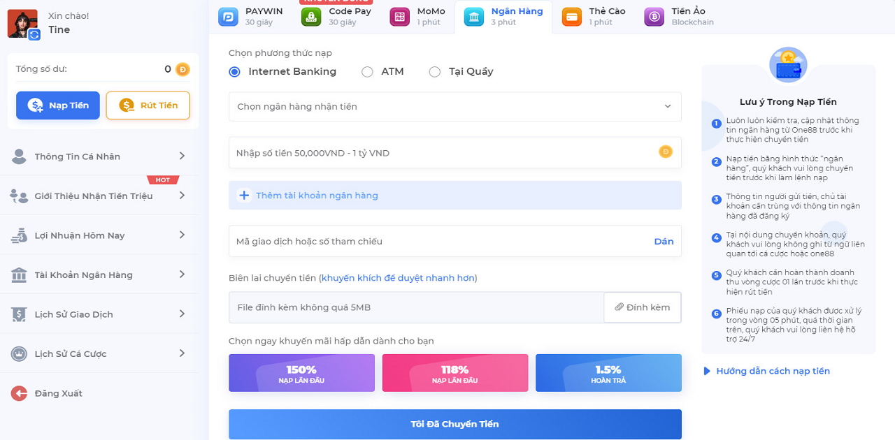 - Bước 3: Sau khi đã lựa chọn được phương thức nạp tiền, bạn cần phải điền đầy đủ tất cả thông tin theo yêu cầu của hệ thống, bao gồm: Họ tên, số tiền mà bạn muốn nạp, mã giao dịch, khuyến mãi (nếu có)…